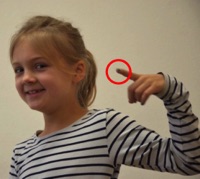 Zeigefinger macht Drehbewegungen neben dem Kopf (R wie „Rad“)